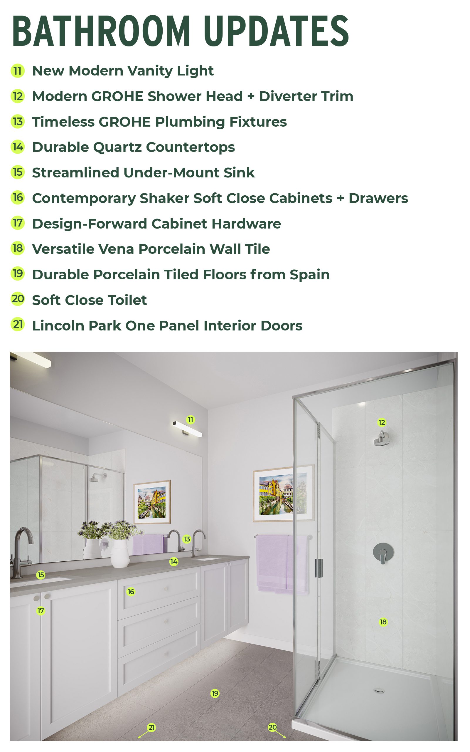 - Deep soaker tubs and oversized showers with surrounding ceramic tile (plan specific)