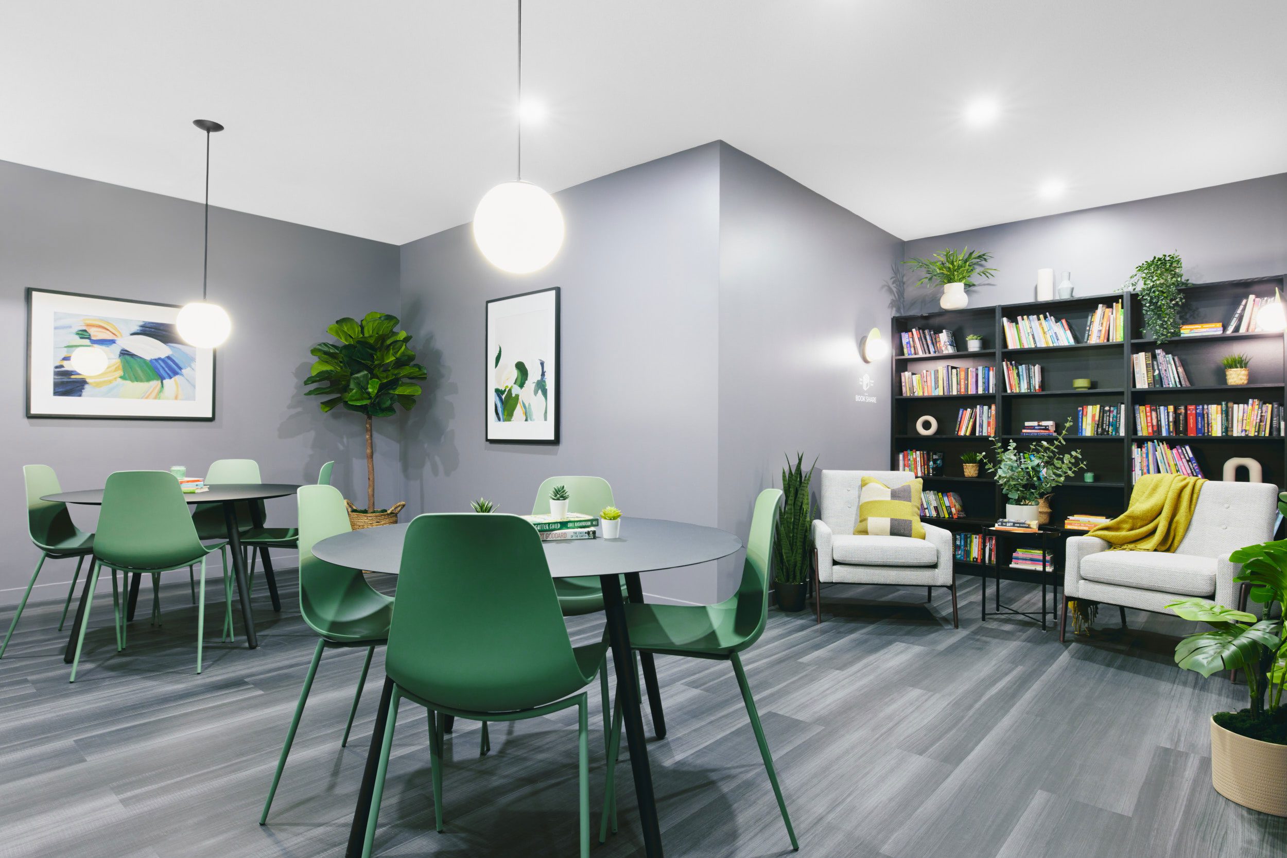 7,000 SF indoor amenity featuring kitchen, dining, fireside lounge, gym, co-working space and arts + crafts room.