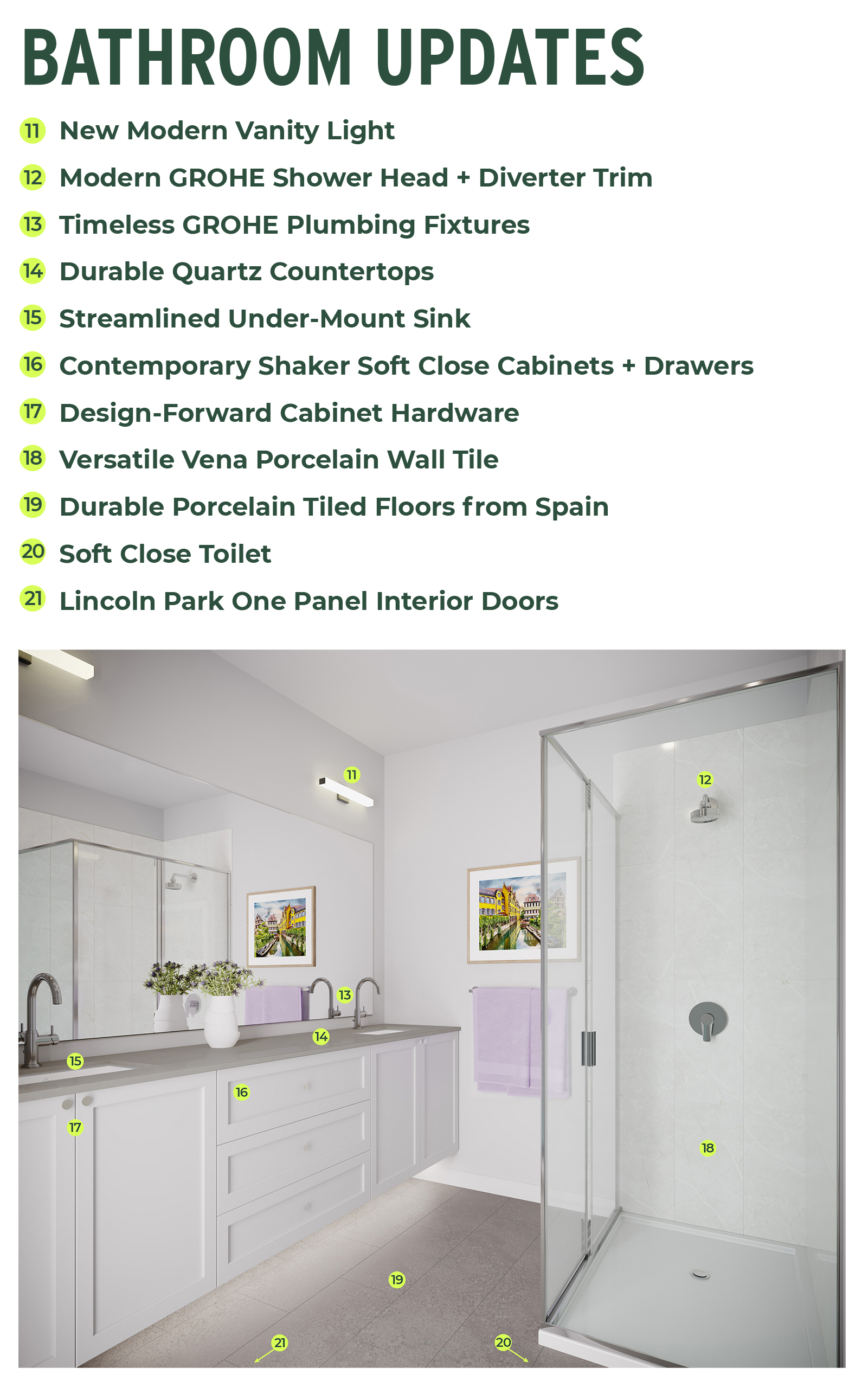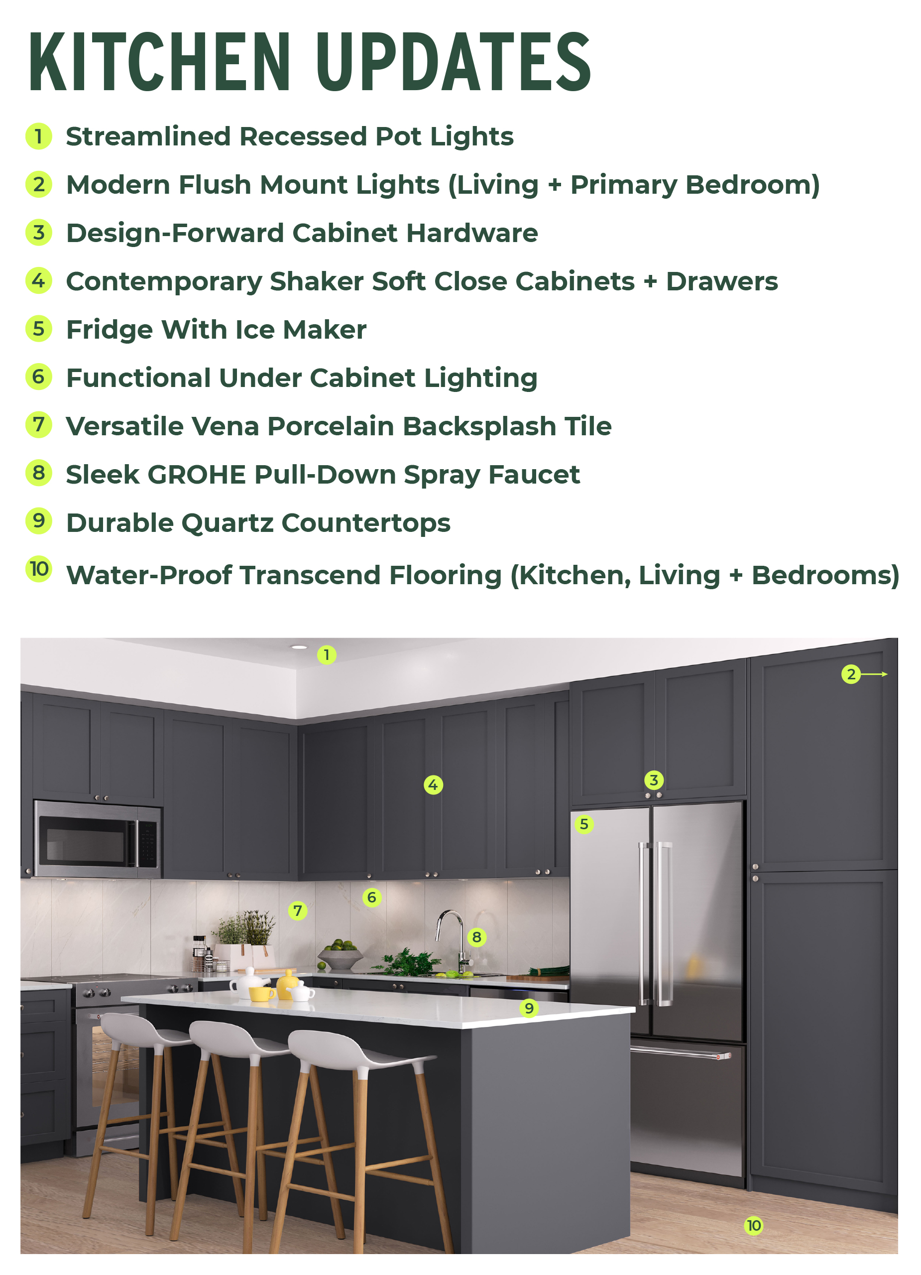 - Contemporary, grey or white or shaker cabinetry with designer brushed nickel hardware and soft close doors + drawers