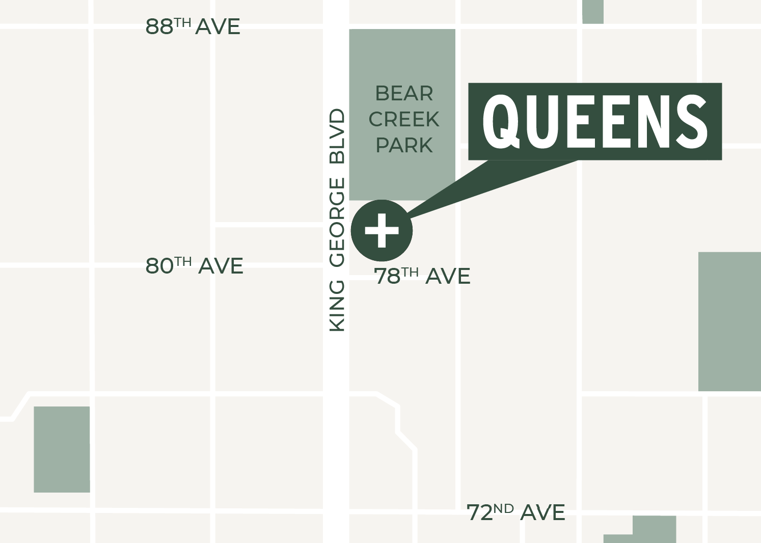 Located 5 minutes south of Surrey City Centre on King George Boulevard, Queens is conveniently positioned on a major transit corridor with rapid B-Line service and planned upgrades to Light Rail or SkyTrain in the future.