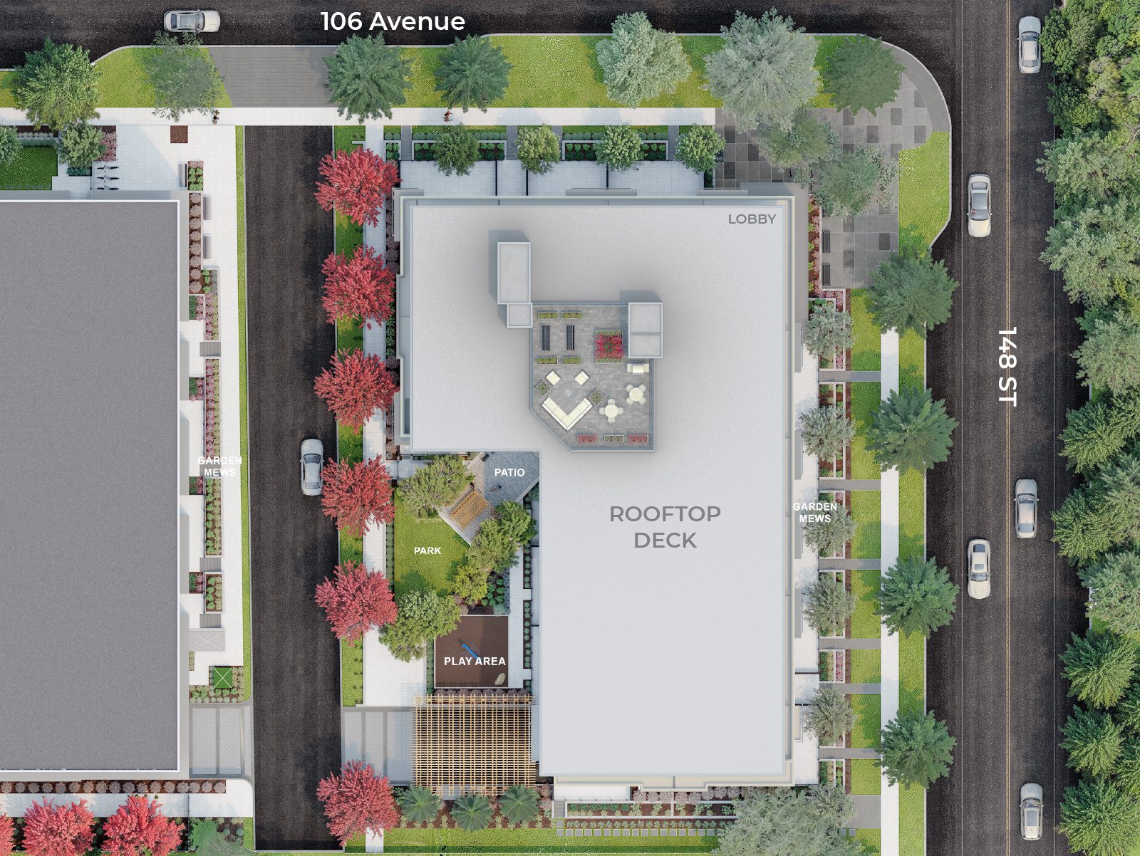 3,200 SF of outdoor amenity space with a park, landscaped walking paths, playground, and a rooftop deck that includes a fire table lounge and BBQ.